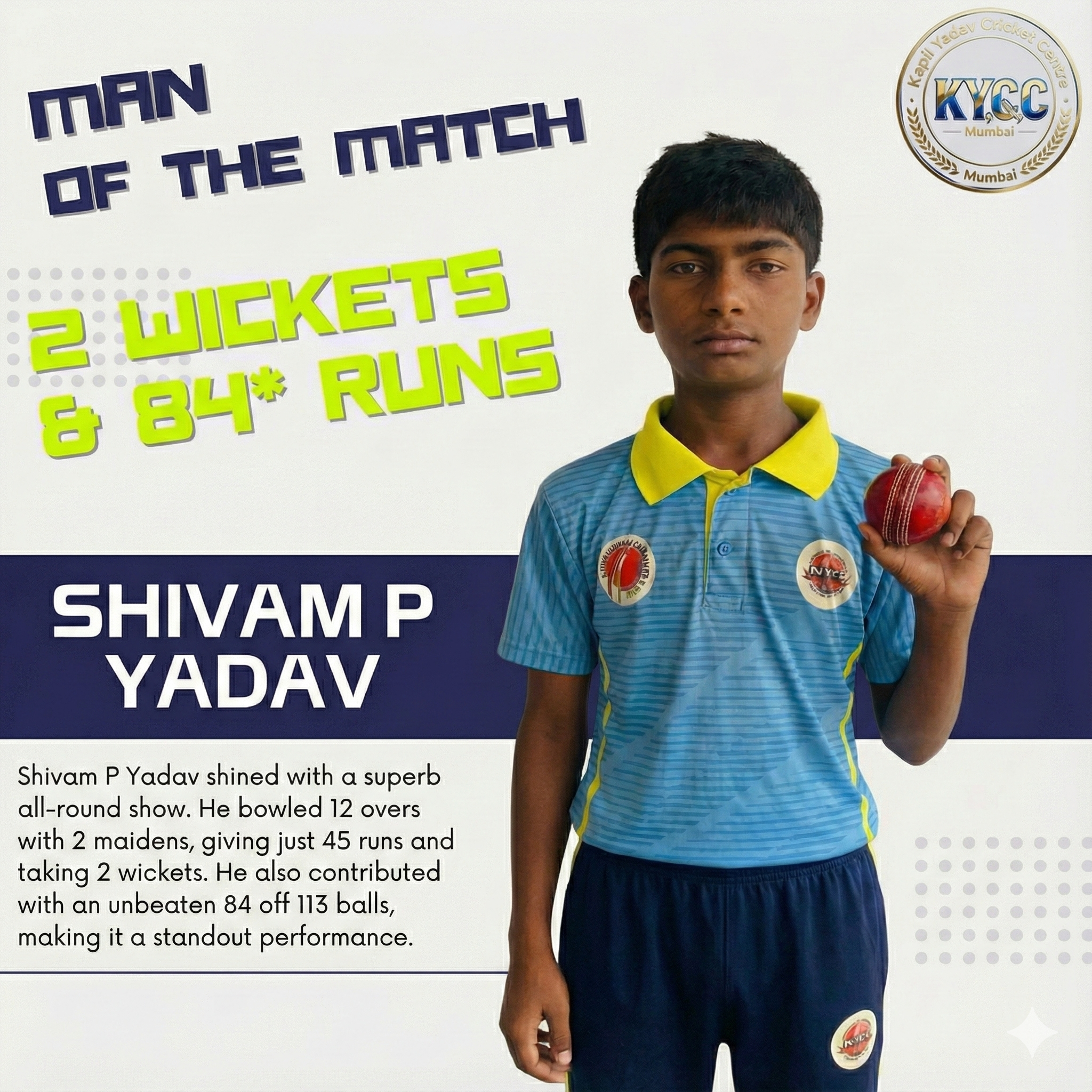 Shivam P Yadav delivered a brilliant all-round performance, showcasing both patience and skill. With the bat, he played a composed and determined knock of 84 not out off 113 balls, holding the innings together and guiding his team with maturity. His contribution didn’t stop there—he impressed with the ball as well, bowling 12 disciplined overs for just 45 runs, claiming 2 important wickets and delivering 2 maiden overs. It was a complete performance that highlighted his consistency, control, and match-winning potential.